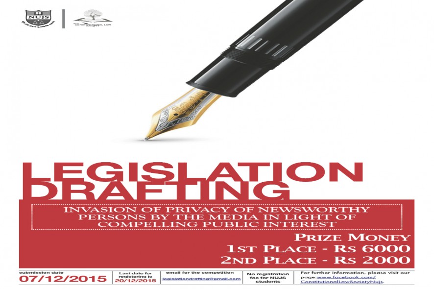 The National University of Juridical Sciences, Kolkata introduced the National Legislation Drafting Competition in the year 2014. During this event they permitted in house students of the WBNUJS to participate and saw an overwhelming response. The response led to awards being given at the DD Basu Endowment Lecture held on a yearly basis and is a feat for the Constitutional Law Society. The Society is proud to have this event now open to other Universities after a successful trial. Last year’s topic was the Refugee Legislation. The Constitutional Law Society has been an active body of the Student Juridical Association and is directly under the supervision of the Institution’s Vice Chancellor Professor Ishwara Bhatt. Whereas this year the attempt is rather unique as the society tries to combine Privacy laws, Information Technology Law and rather obvious the law governing the Constitution-Constitutional law. The Topic of this year’s Second Legislative Drafting Competition is ‘Invasion of Privacy of Newsworthy Persons by the Media in light of Compelling Public Interest‘.