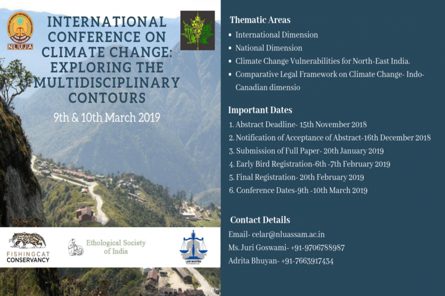 National Law University and Judicial Academy, Assam is organising an “International Climate Change Conference: Exploring Multidimensional Contours” on 9th-10th of March, 2019.