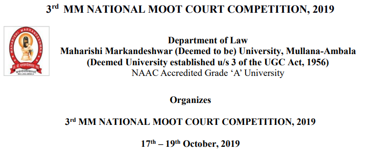 Department of Law , Maharishi Markandeshwar (Deemed to be University), Mullana – Ambala in organizing “3rd MM National Moot Court Competition-2019 on 17th to 19th October, 2019 .