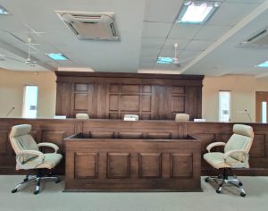 15:00 The teams are in the courtroom now. Last-minute prep continues as they complete the pre-round formalities. Teams are discussing how to communicate with each other during the course of the rounds. The panelists have arrived and are now seated, ready to begin the rounds. Our today’s esteemed panelists are: