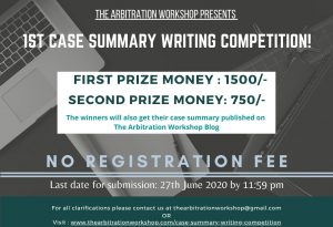 15. All submissions shall be emailed to  thearbitrationworkshop@gmail.comwith the subject – “Submission for 1st Case Summary Writing Competition, 2020.”