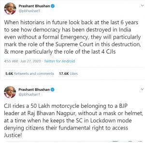 The matter deals with certain tweets made by Bhushan. He had recently criticised the Supreme Court and the sitting and former CJIs in a couple of tweets which prompted the Supreme Court to initiate suo motu contempt petition against him. Here are the tweets: