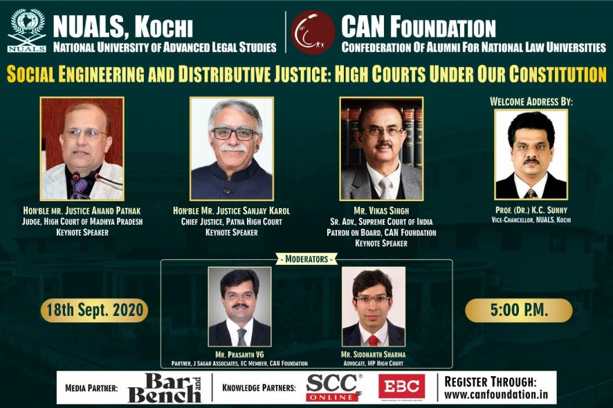 National University of Advanced Legal Studies (NUALS), Kochi, in collaboration with CAN Foundation is set to organize an enlightening Online Session by Hon’ble Justice Mr. Sanjay Karol, Chief Justice, Patna High Court along with Mr. Justice Anand Pathak, Judge, High Court of Madhya Pradesh and Mr. Vikas Singh, Senior Advocate, Supreme Court of India on 18th September i.e Friday at 5:00 P.M. The Panelists shall be deliberating upon the topic of “Social Engineering & Distributive Justice: High Courts Under Our Constitution”.