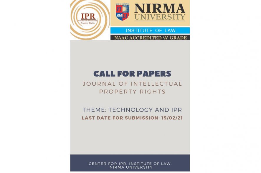 The Centre for Intellectual Property Rights, Institute of Law, Nirma University, Ahmedabad, Gujarat hereby invites articles, research papers, Essays, case comments, studies, and book reviews on “Technology and Intellectual Property Rights” for publication in the 6th Issue of the Journal of Intellectual Property Law, Nirma University, for its 2020 – 21 volume.