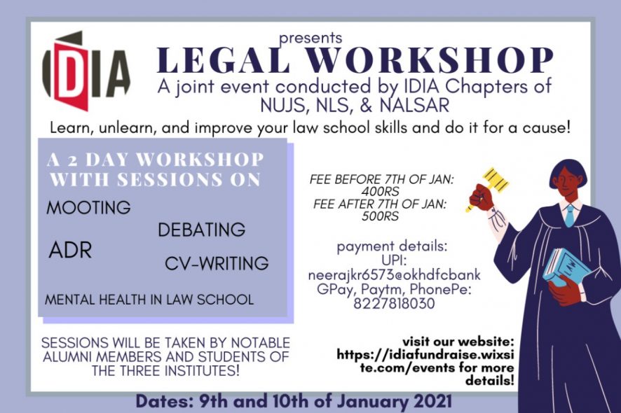 As part of our fundraising program, the IDIA Chapters of West Bengal, Karnataka, and Hyderabad are jointly conducting a two-day Legal Workshop on 9th and 10th January, 2021. The Workshop will help participants in improving their skills in various activities that are part and parcel of life in a law school. The workshop will contain 5 sessions, covering the following 5 areas: