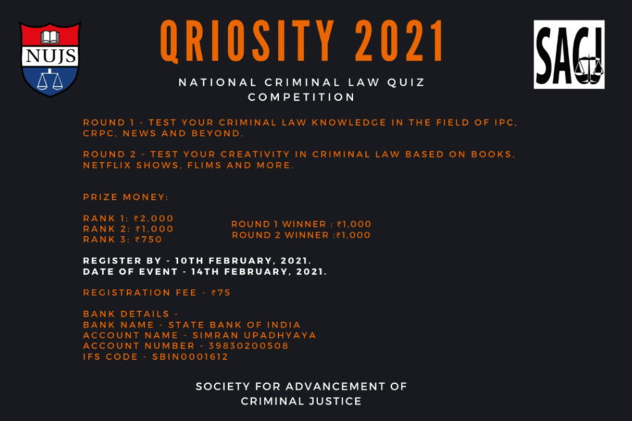 The Society for Advancement of Criminal Justice (SACJ) at the National University of Juridical Sciences (NUJS), Kolkata, is organising the 5th edition of “QRIOSITY”, a criminal law quiz which is one of our flagship events.