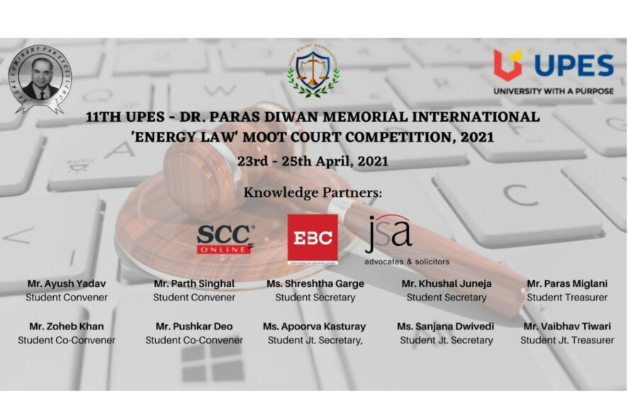 The Moot Court Association of School of Law, UPES, Dehradun is pleased to announce the 11th DR. PARAS DIWAN MEMORIAL INTERNATIONAL ENERGY LAW MOOT COURT COMPETITION, 2021. The moot is scheduled from 23rd-25th, April 2021.