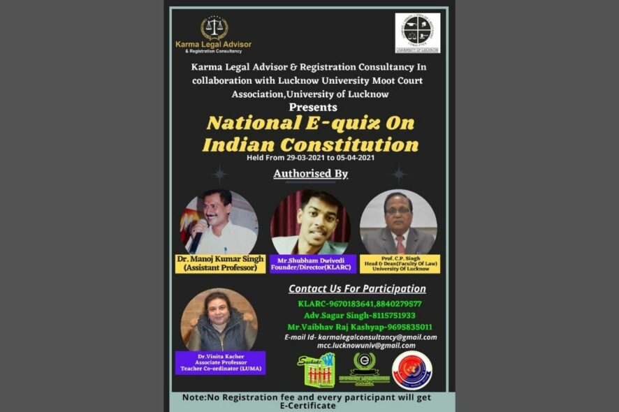 Karma Legal Advisor & Registration Cosultancy is organising National E-Quiz on Indian Constitution in collaboration with *Lucknow University Moot Court Association,University of Lucknow*