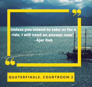16:37 Arbitrator Andrew Tettenborn seeks to clarify whether there exists a Bill of Lading under COGSA. The Speaker, having made her way through four preliminary rounds, a quarter final round and a semi-final round, answers the question promptly and correctly. A follow up question is again asked, which is satisfactory too.