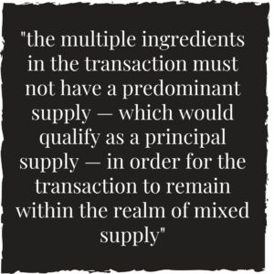 price; and it must not be a composite supply. In other words, the multiple ingredients in the transaction must not have a predominant supply which would qualify as a principal supply in order for the transaction to remain within the realm of mixed supply. The illustration appended to the statutory definition of mixed supply also seems to confirm this underlying tenet. It refers to “a package consisting of canned foods, sweets, chocolates, cakes, dry fruits, aerated drinks and fruit juices” which are for a single price. Because each of these supplies are independent and can be made separately, there is no overwhelming element predominating the supply and hence the illustration does not represent a composite supply despite a single price being charged for the transaction and therefore it is an example of mixed supply.