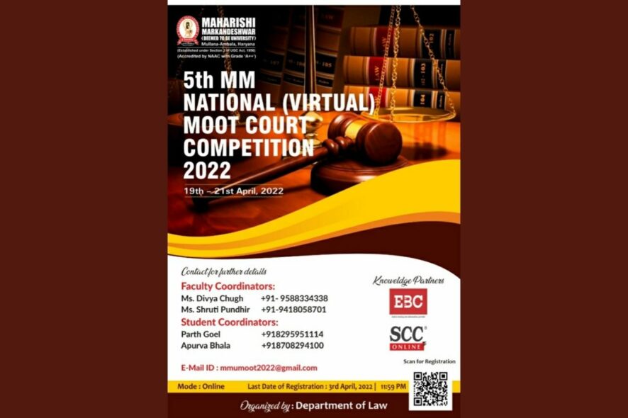 The Department of Law, Maharishi Markandeshwar (Deemed to be) University is pleased to inform you that it is all set to organise its flagship event of the year, the 5th MM National (Virtual) Moot Court Competition, 2022 on 19th -21st April 2022.