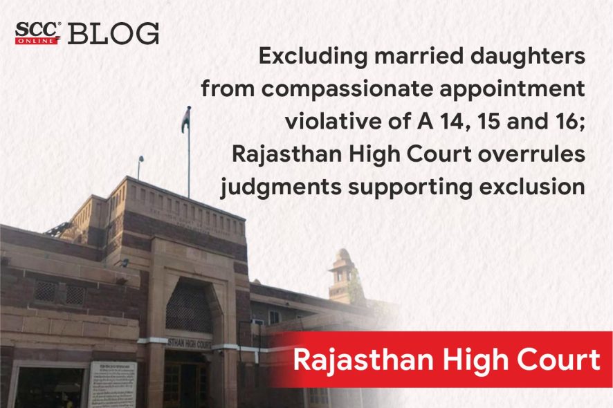 Rajasthan High Court: The present petition challenges the position of law prior to the amendment of Rule 2(c) of Rajasthan Compassionate Appointment of Dependents of Deceased Government Servant Rules, 1996, which excludes the married daughter from the definition of ‘dependent’, for the purpose of compassionate appointment vide Notification dated 28-10-2021, a 3-Judge-Bench of Sandeep Mehta, Vijay Bishnoi and Arun Bhansali, JJ. held that the provision of Rule 2(c) of Rajasthan Compassionate Appointment of Dependents of Deceased Government Servant Rules, 1996, which exclude the married daughter from definition of dependent prior to its amendment vide notification dated 28.10.2021, is discriminatory and violative of Articles 14 to 16 of the Constitution of India and as such, the word ‘unmarried’ from the definition of ‘dependent’, is struck down. Further, in Rule 5 of Rajasthan Compassionate Appointment of Dependents of Deceased Government Servant Rules, 1996 also the word unmarried daughters/adopted unmarried daughter, shall be read as daughters/adopted daughter.