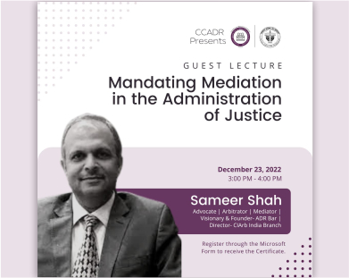 The CCADR, CNLU, is going to organise a guest lecture on “Mandating Mediation in the Administration of Justice” on 23rd December, 2022 by Mr. Sameer Shah, Director, Chartered Institute of Arbitrators (India).
