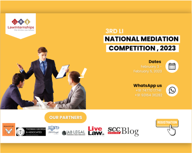 3rd LI National Mediation Competition 2023 is an online competition organized by LawInternships (The Online Law School). We had it’s 1st and 2nd chapter in the year 2020 and 2022 respectively with the vision to promote process of mediation to the young minds. With mediation gaining traction as an effective and efficient means of alternative dispute resolution, with the same inspiration LawInternships (The Online Law School) continuing the third chapter of National Mediation Competition. This competition will be conducted virtually allowing the students to hone their advocacy skills with respect to mediation. This Competition will provide an opportunity to the participants to develop the requisite skills for a dynamic process of Mediation. The competition invites participation either in team or as an individual.