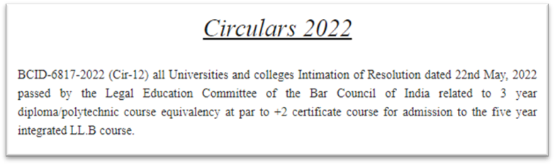 The Bar Council of India recently updated the eligibility criteria for admission to 5-year integrated LL.B. course, which was the ultimate ground for denial of petitioner's admission. BCI recently issued a circular which grants equivalency to the qualification of 3-year Diploma/Polytechnic course with that of 10+2 certificate course for admission to 5-year integrated LL.B. course.