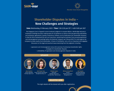 The Singapore Court of Appeal’s recent landmark judgment in Anupam Mittal v. Westbridge Ventures II Investment Holdings has been making waves for its guidance on issues of the law governing arbitrability and arbitration agreements. Equally contentious, however, are its implications for shareholder disputes, in that the SGCA maintained the anti-suit injunction, restraining the promoter from pursuing oppression and mismanagement proceedings before the National Company Law Tribunal (NCLT) in India against the company’s private-equity fund shareholder, in favour of arbitration. Join us for an important and engaging discussion on the legal and practical issues stemming from the judgment, including: