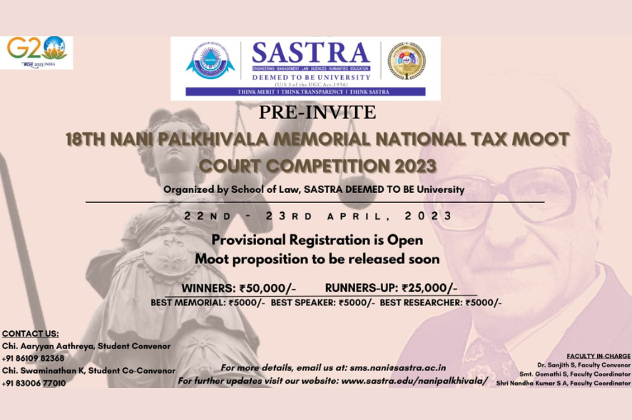 School of Law, SASTRA Deemed University, Tanjore proudly announces the 18th edition of Nani Palkhivala Memorial National Tax Moot Court Competition, 2023 to be held from 22nd April to 23rd April.