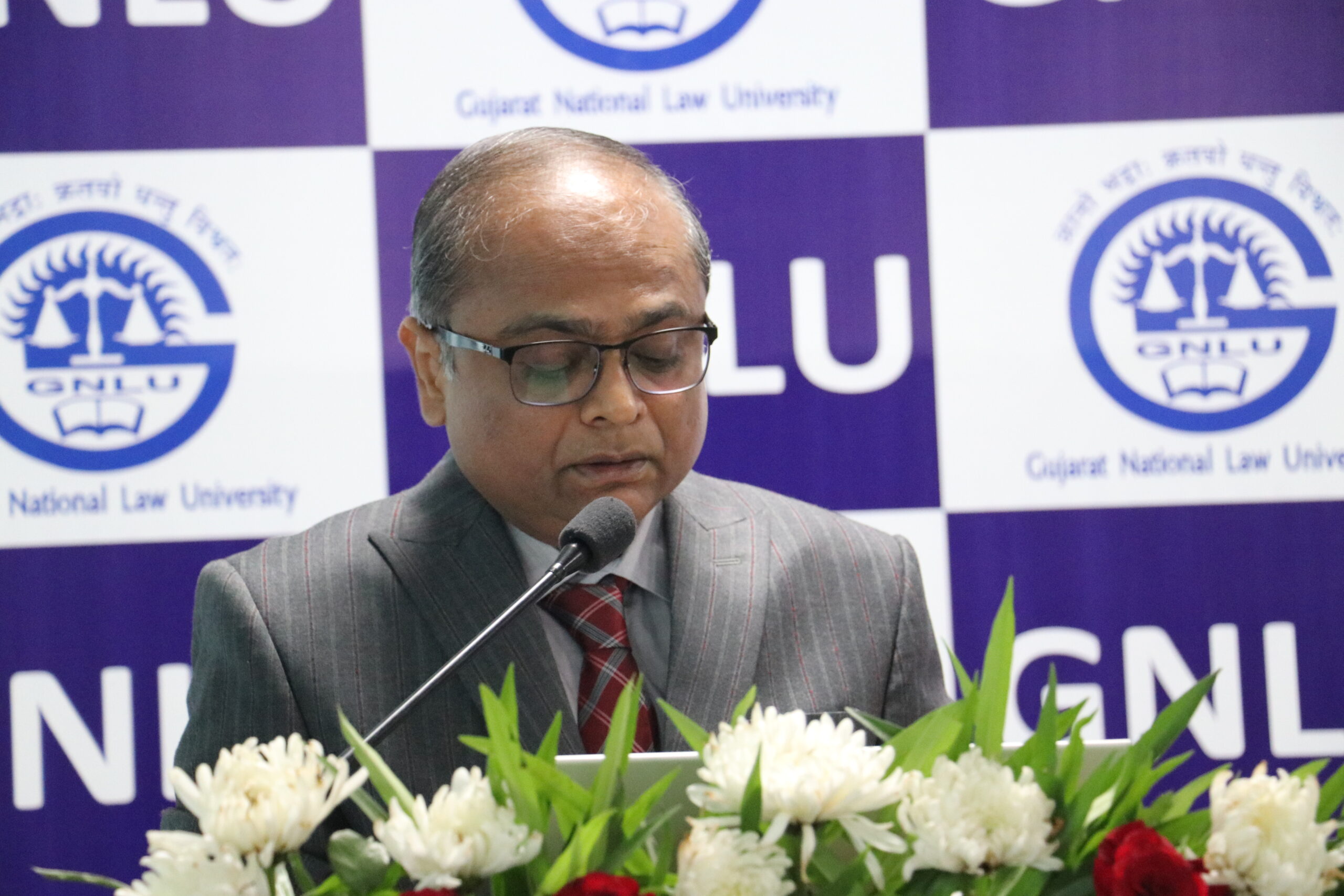 10:15 AM: Inaugural Ceremony – The halls of Gujarat National Law University are abuzz with excitement and anticipation for what the forum holds. The inaugural ceremony is about to begin, with the Chief Guest, Hon’ble Justice Mr. Vipul Pancholi of the High Court of Gujarat and Prof. (Dr.) S. Shanthakumar, Director, GNLU taking their seats on stage. The ceremony is also graced by the Guest of Honour, Senior Advocate Indira Jaising and Special Guest, Ms. Sneha Sharma, who have joined us virtually. Dr. Jagadeesh Chandra T.G., Registrar, GNLU and Prof (Dr.) Hardik H. Parikh, Faculty Convenor, GNLU LSC have also joined the Chief Guest and the Director on the stage.