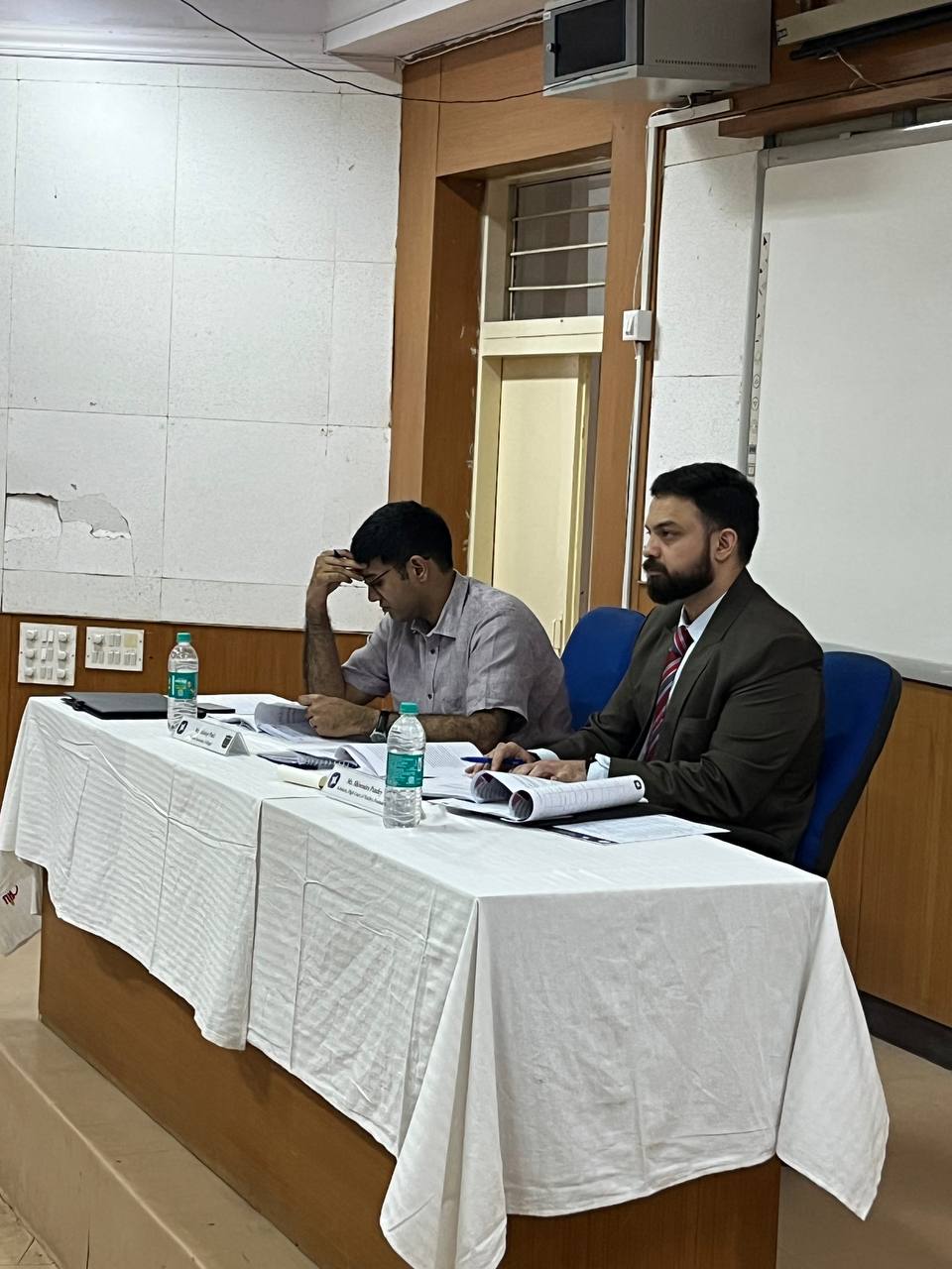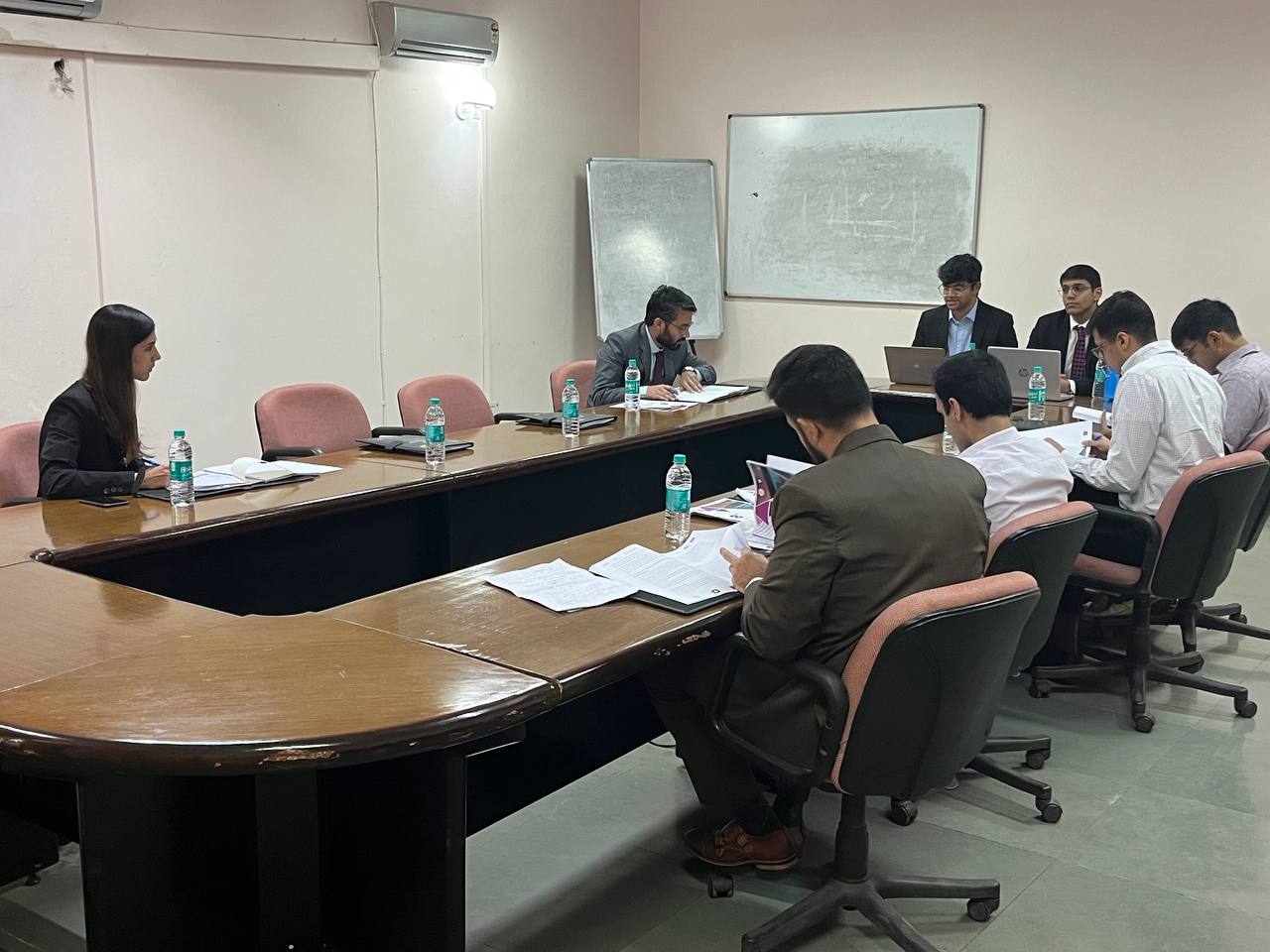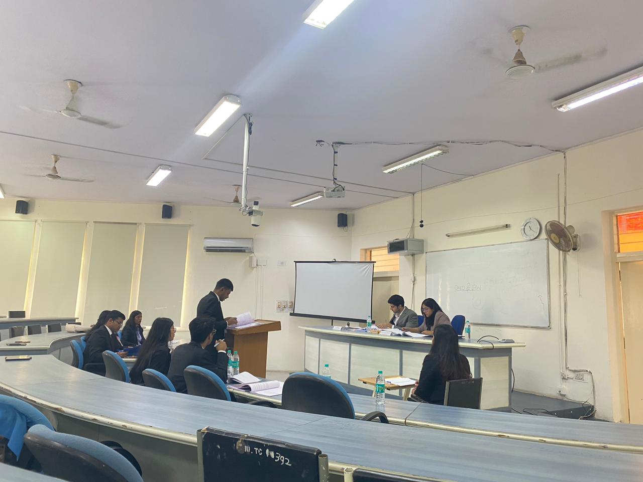 The events of the final day begin with a judge’s briefing session for the semi-final rounds by Mr. Aryaman Vachher and Mr. Kartik Sharma. The attendees of the briefing are senior partners and supreme court advocates who will be judging the semi-final rounds. They discuss the facts of the problem. The judges have a discussion regarding the issues of the problem and their opinions of the same. The judge’s are also briefed about the scoresheets and the parameters on which participants are supposed to be marked along with the rules of the competition. As the briefing concludes, and the judges proceed to their respective courtrooms in the academic block.