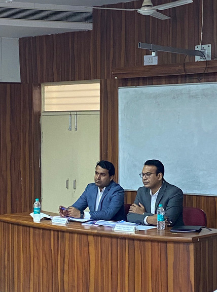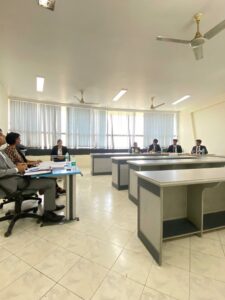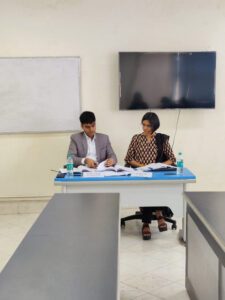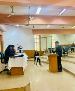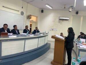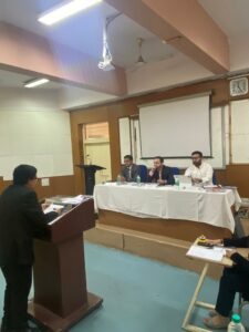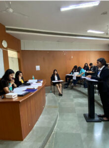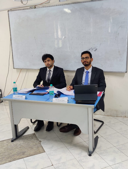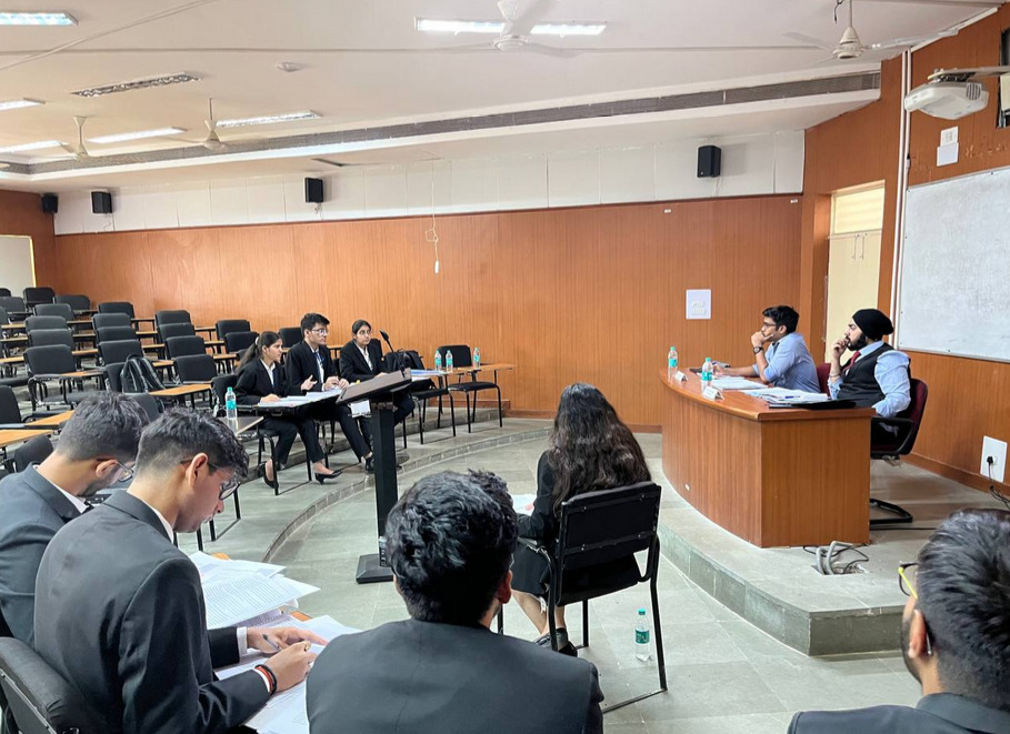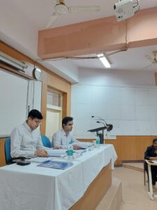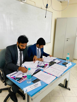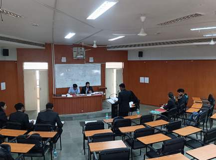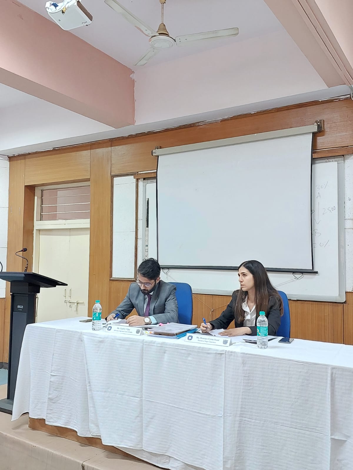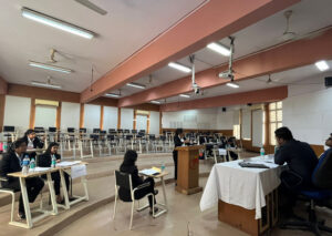The events of the final day begin with a judge’s briefing session for the semi-final rounds by Mr. Aryaman Vachher and Mr. Kartik Sharma. The attendees of the briefing are senior partners and supreme court advocates who will be judging the semi-final rounds. They discuss the facts of the problem. The judges have a discussion regarding the issues of the problem and their opinions of the same. The judge’s are also briefed about the scoresheets and the parameters on which participants are supposed to be marked along with the rules of the competition. As the briefing concludes, and the judges proceed to their respective courtrooms in the academic block.