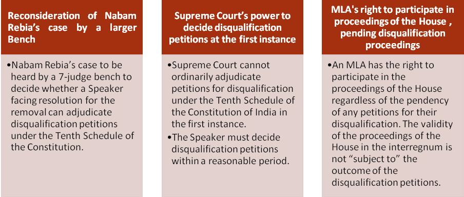 The Court directed the Nabam Rebia’s case to be reconsidered by a 7-judge bench because a substantial question of law remains to be settled. The Court has framed the following questions: