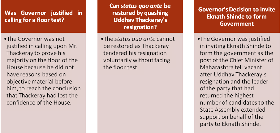 As the leader of the party that had returned the highest number of candidates to the State Assembly extended support on behalf of the party to Eknath Shinde, the Court, hence, held that the decision of the Governor dated 30-06-2022, inviting Shinde to form the Government, was justified.
