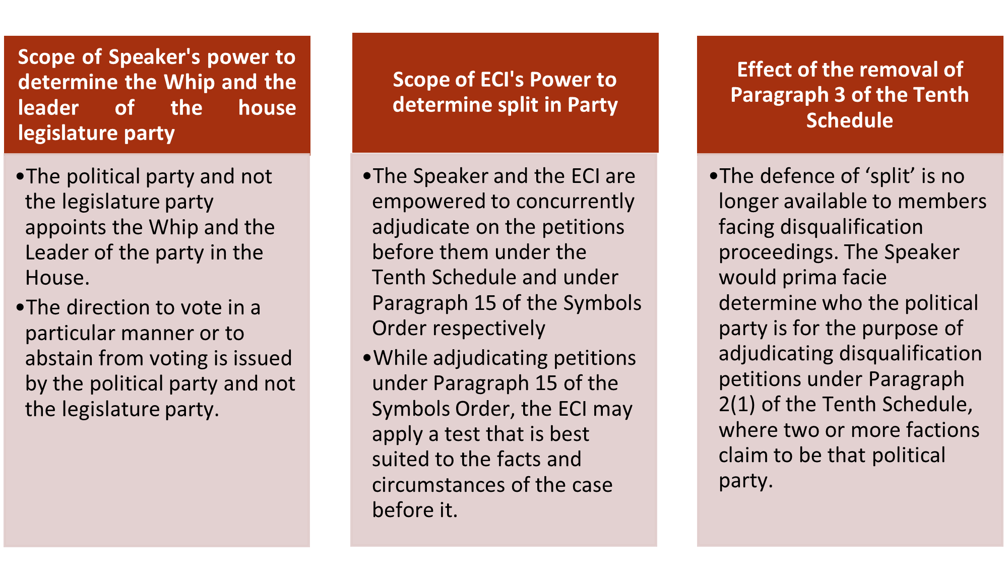 • The question as to whether the decision of the ECI under the Symbols Order must be consistent with the decision of the Speaker under the Tenth Schedule, was answered in negative as the decision of the Speaker and the decision of the ECI are each based on different considerations and are taken for different purposes.