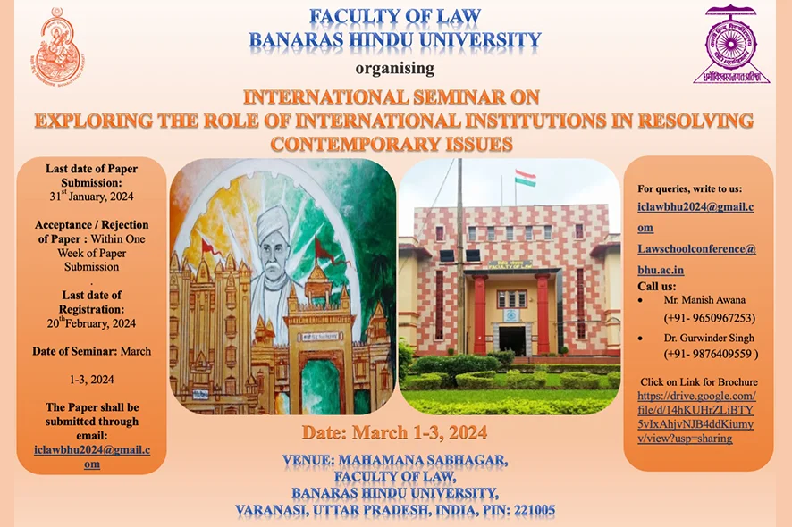 ABOUT THE EVENT: The Faculty of Law, Banaras Hindu University, is organising a Three days International Seminar On “Exploring The Role Of International Institutions In Resolving Contemporary Issues” to be held from March 1-3, 2024