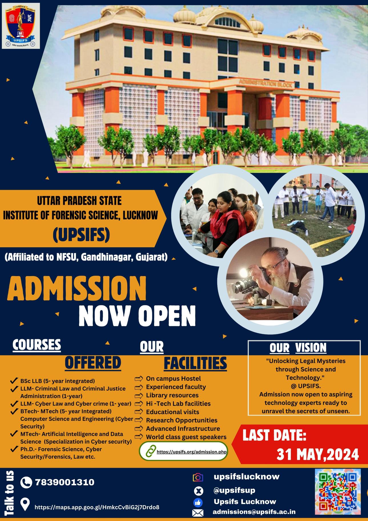 UPSIFS, Lucknow invites prospective students to be part of this transformative journey. Together, let’s forge a path towards excellence in the fields of forensic science and legal studies, equipping students with the knowledge and skills to excel in their careers and contribute meaningfully to society.