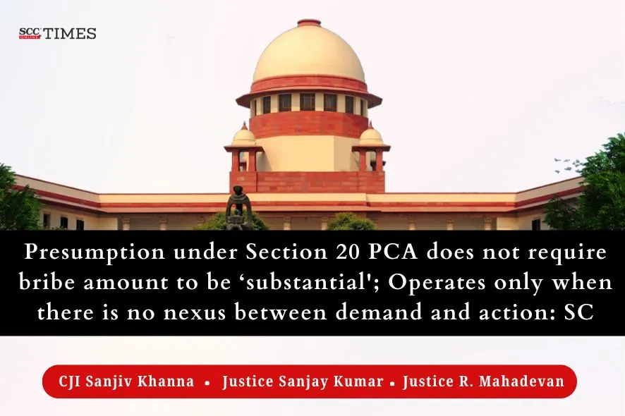 Supreme Court: In a criminal appeal against the decision of the Karnataka High Court, setting aside the conviction of the accused/ respondent and thereby acquitting him of the charges punishable under Sections 7 and 13(1)(d) r/w Section 13(2) of the Prevention of Corruption Act, 1988 (‘the Act’), the three-Judge Bench comprising of CJI Sanjiv Khanna, Sanjay Kumar and R. Mahadevan*, JJ. set aside the High Court’s decision terming it as illegal, erroneous and contrary to the materials on record. In the present case, the recovery of the bribe amount from the accused was duly proved. The Court observed that, once the aspects of ‘demand’ and ‘acceptance’ of the bribe amount have been established beyond doubt, no two views are possible in the matter. Thus, the approach adopted by the High Court was perverse and liable to be interfered with. The Trial Court was directed to take necessary steps to secure the accused and commit him to prison to undergo the remaining sentence period and recover the fine imposed on him.