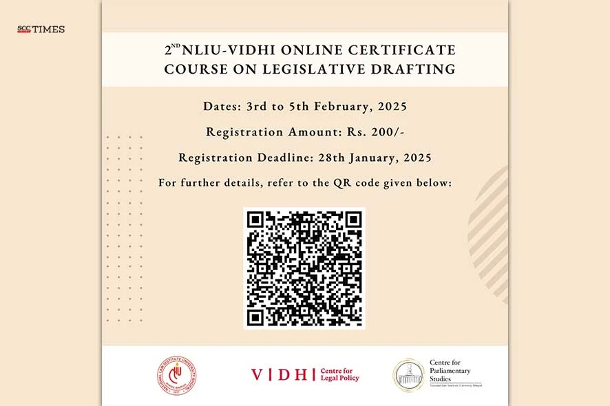 The Centre for Parliamentary Studies (“CPS”) at NLIU Bhopal is offering a certificate course on legislative drafting in collaboration with Vidhi Centre for Legal Policy. The course is to be organized from 3rd February to 5th February 2025 on a virtual platform. The instructors during the course shall be experts from the field of legislative drafting.