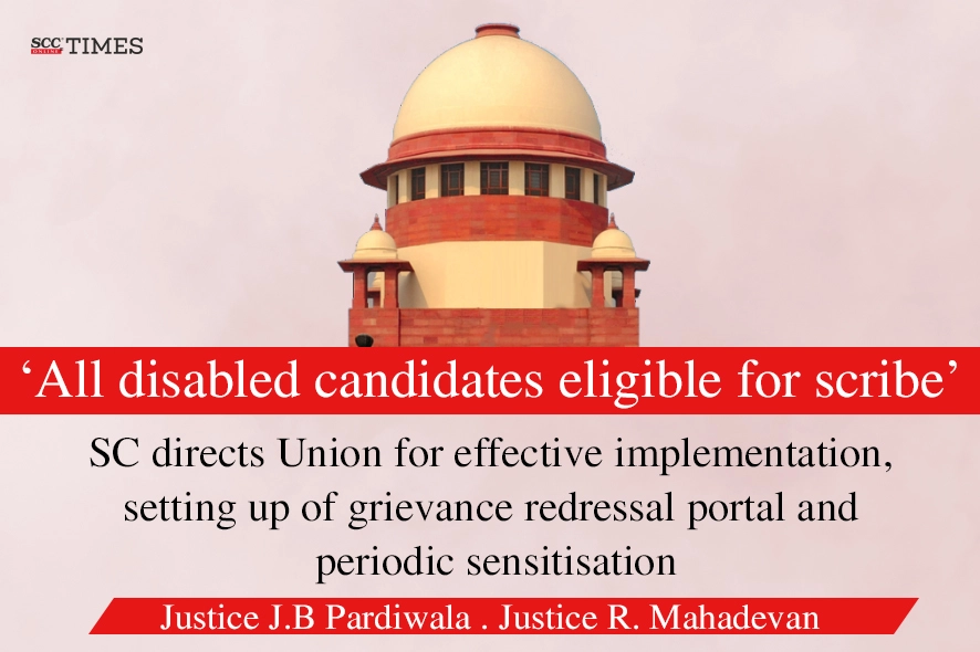 Supreme Court: In a writ petition filed as Public Interest Litigation, seeking a writ of mandamus directing the respondents to provide the petitioner with the facility of a scribe, compensatory time, and all other facilities, to which he may be entitled, considering his disability status for the upcoming examinations, the Division Bench of JB Pardiwala and R. Mahadevan*, JJ. allowed the petition and held that all disabled candidates are entitled to use scribes for writing exams, without meeting the previously required benchmark disabilities criteria in light of Vikas Kumar v. Union Public Service Commission (2021) 5 SCC 370, wherein, it was held that it would be discriminatory to restrict the facilities of a scribe for only PwBD candidates.