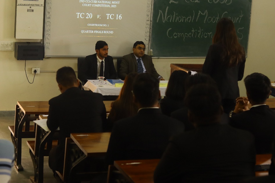 The performance given by the finalists were outstanding and enthralling. This phase witnessed engaging discussion between the honourable judges and the participants in aspects of law and facts of the problem. The counsels were thoroughly questioned by the judges to extract the most coherent arguments. The participants put up a brave face as they answered the questions to the best of their ability in order to put forth their most convincing arguments. The judges primarily focused on the legal backing of the arguments with relevant case laws and precedents. The participants gained valuable experience in the art of answering the queries of the judges with precision and brevity. All this made the environment around the court room very informative. After witnessing an exhilarating round of finals between TC- 20 as the Appellant and TC-12 as the respondent, the 2nd CCI-CUSB National Moot Court Competition 2025, came one step closer to its completion. With the valedictory ceremony being the only remaining event, the finalist along with all the participating teams moved towards the Moot Court Hall, the venue for the Valedictory ceremony.