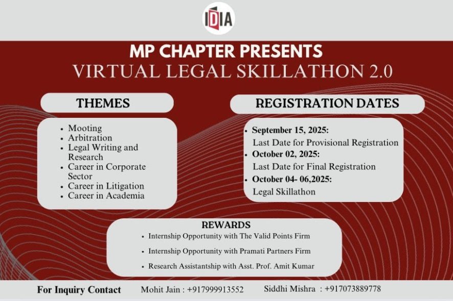 It has announced the ‘IDIA-MP Chapter Legal Skillathon 2.0‘ and invites students to participate in one of the comprehensive 3-day virtual workshops organised by the IDIA-MP Chapter.