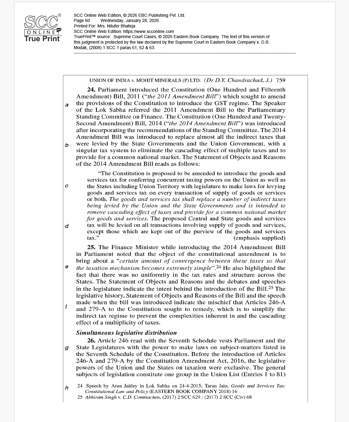 The third part provides a cross-sectional analysis of the legal and economic concepts that form the conceptual foundation of GST as a tax on the supply of goods and services. Although not explicitly addressed in the Constitution Amendment Act, these concepts are integral to GST’s design and interpretation. Drawing, inter alia, on comparative jurisprudence such as that of the European Court of Justice, the section highlights the importance of design-led interpretation in resolving complexities and ambiguities in fiscal law.