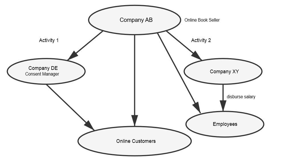 Say Company AB has 2000 employees, and its object is to sell books online. The company also employs the services of Company XY for disbursing salaries of its employees and Company DE to manage consent of its online customers. A diagram below will aid in visualising the activities of Company AB.