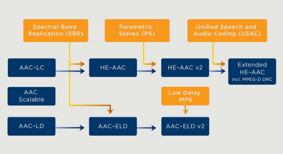 The AAC licensing program includes several advanced audio technologies, ensuring that implementers have the tools they need to develop cutting-edge applications. AAC-low complexity (LC) is the base profile that offers excellent audio quality and efficient compression. High-efficiency (HE)-AAC utilises spectral band replication (SBR) to enhance performance at low bitrates, making it ideal for streaming and mobile use. HE-AAC v2 adds parametric stereo (PS) to enhance stereo quality in low-bitrate applications. Extended HE-AAC (xHE-AAC) is also part of the program. It has MPEG-D dynamic range control (DRC) for adaptive audio experiences. AAC-low delay (LD) and AAC-enhanced low delay (ELD) are also part of the program. These are for real-time communication, such as videoconferencing, where high-quality audio and low latency are crucial. AAC-ELD can also be used in conjunction with MPEG surround to create immersive and interactive multi-channel audio with minimal delay.