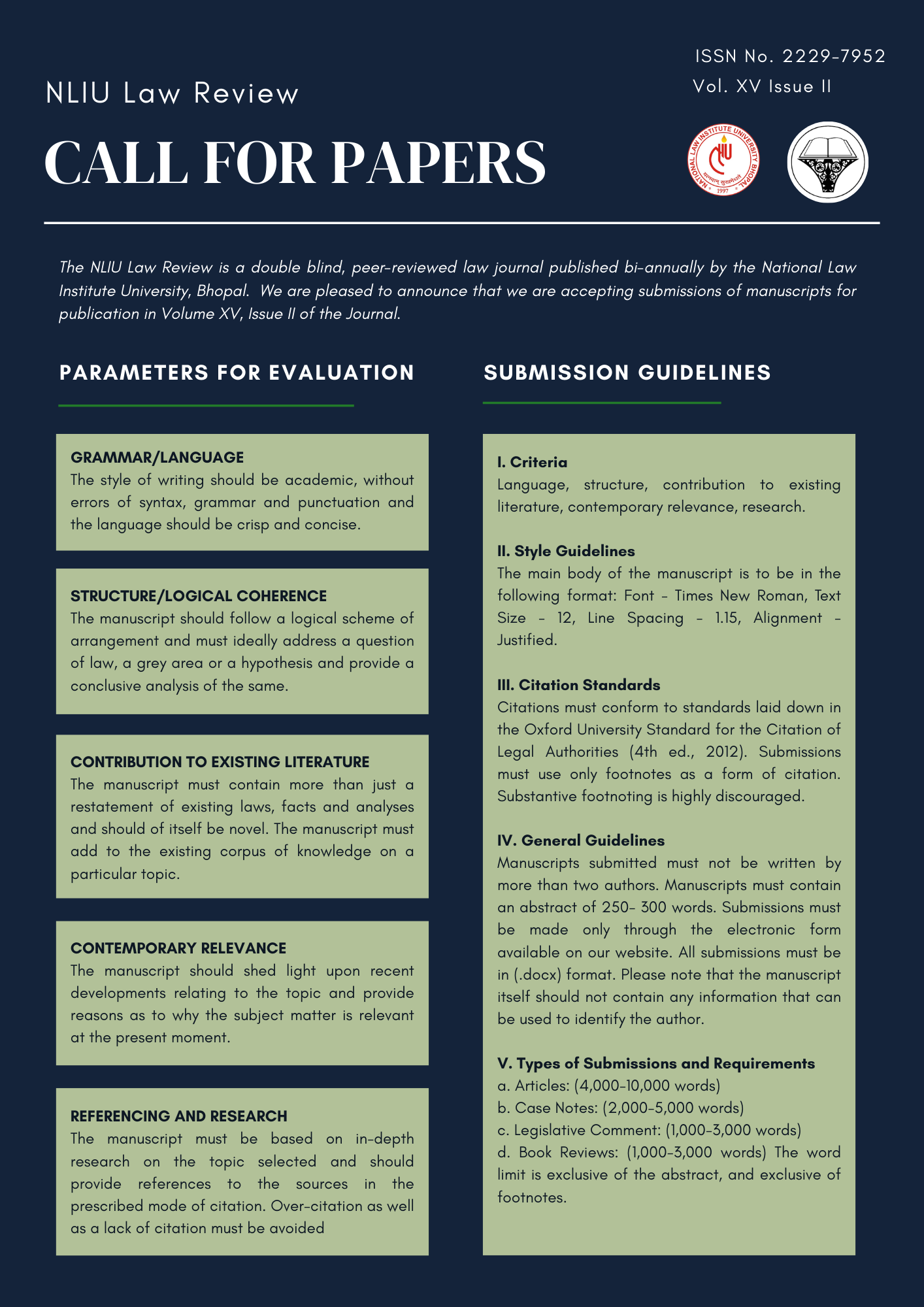 NLIU Law Review is now accepting submissions of manuscripts for publication in Volume XV Issue II of the Journal.