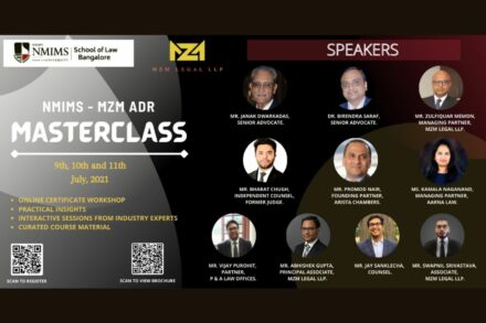 Narsee Monjee Institute of Management Studies (NMIMS), School of Law, Bangalore announced NMIMS MZM ADR MASTERCLASS on ALTERNATIVE DISPUTE RESOLUTION in association