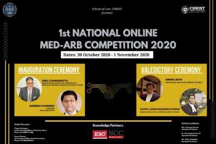 About the event: The1stNationalOnlineMed-ArbCompetition,2020wasconductedbytheAlternativeDispute Resolution Board of School of Law, CHRIST (Deemed to be University) from 30thOctober, 2020 to 1stNovember, 2020. The