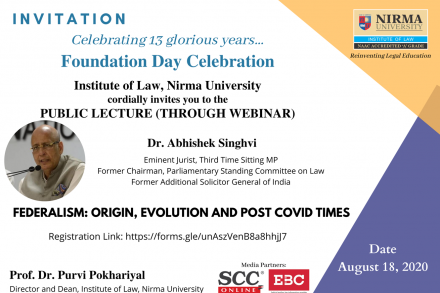 Institute of Law, Nirma University organising public lecture on the occassion of Foundation Day Celebration. The webinar on Federalism: Origin, Evolution and